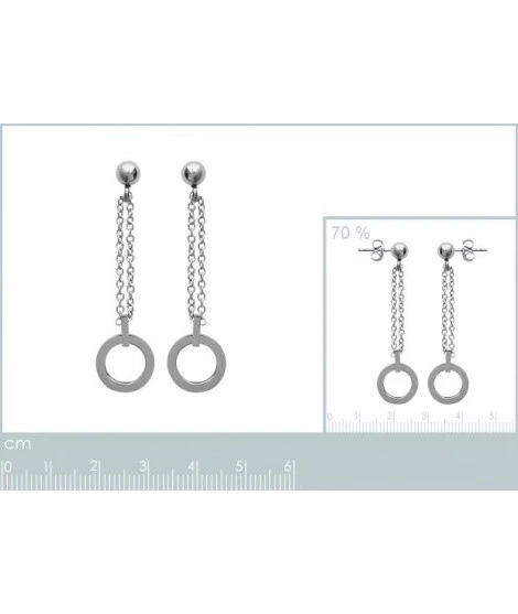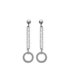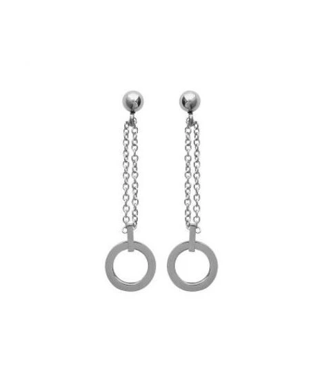 Boucles d’oreilles en acier, pendantes, modèle « bulle » sur chaĂ®ne. Hauteur totale : 44 mm. Largeur : 12 mm. Paire livrĂ©e dans sa jolie pochette organza.