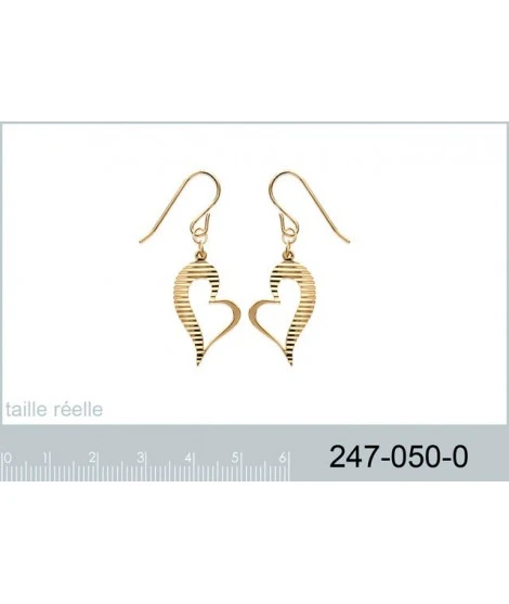Boucles d’oreilles pendantes en plaquĂ© or garanti 10 ans, joli coeur asymĂ©trique rayĂ© Ă l’horizontal sur le devant. Hauteur totale : 40 mm. Largeur : 14 mm. LivrĂ©es dans leur jolie pochette organza.