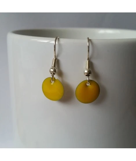Boucles d’oreilles en mĂ©tal argentĂ©, Ă©mail Ă©poxy, mĂ©daille de 10 mm sur chaque, couleur jaune « citron ». LĂ©gères et agrĂ©ables Ă porter. Hauteur totale : 25 mm. Disponible en plusieurs couleurs, Ă assortir Ă votre tenue vestimentaire. LivrĂ©es dans leur jolie pochette.