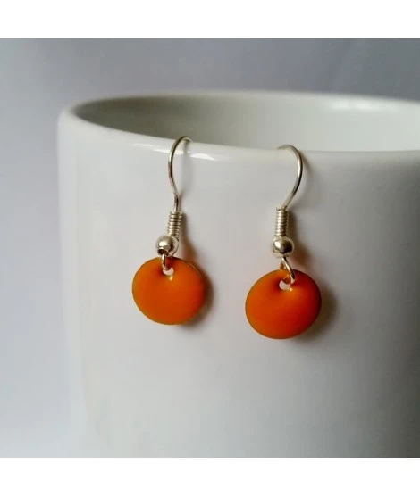 Boucles d’oreilles en mĂ©tal argentĂ©, Ă©mail Ă©poxy, mĂ©daille de 10 mm sur chaque, couleur orange. LĂ©gères et agrĂ©ables Ă porter. Hauteur totale : 25 mm. Disponible en plusieurs couleurs, Ă assortir Ă votre tenue vestimentaire. LivrĂ©es dans leur jolie pochette.