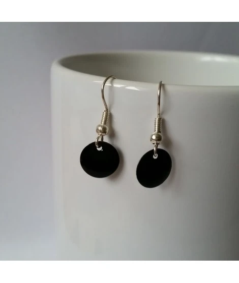 Boucles d’oreilles en mĂ©tal argentĂ©, Ă©mail Ă©poxy, mĂ©daille de 10 mm sur chaque, couleur noire. LĂ©gères et agrĂ©ables Ă porter. Hauteur totale : 25 mm. Disponible en plusieurs couleurs, Ă assortir Ă votre tenue vestimentaire. LivrĂ©es dans leur jolie pochette.
