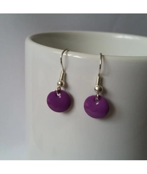 Boucles d’oreilles en mĂ©tal argentĂ©, Ă©mail Ă©poxy, mĂ©daille de 10 mm sur chaque, couleur violette « cassis ». LĂ©gères et agrĂ©ables Ă porter. Hauteur totale : 25 mm. Disponible en plusieurs couleurs, Ă assortir Ă votre tenue vestimentaire. LivrĂ©es dans leur jolie pochette.