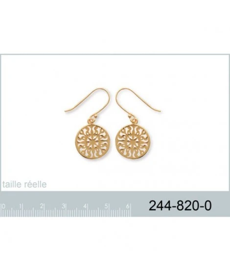 Boucles d’oreilles plaquĂ© or garanti 10 ans. MĂ©daille style dentelle. Diamètre : 16 mm. Hauteur totale : 35 mm. LivrĂ©es dans leur jolie pochette organza. Disponibles en version bracelet assorti.