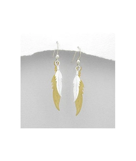 Boucles d’oreilles composĂ©es chacune de 2 plumes (1 en argent et 1 en plaquĂ© or 14 carats), style indien. Très belle finition, de toute beautĂ© ! Hauteur totale : 42 mm. Largeur : 7 mm. Poids d’argent : 2,9 grammes. LivrĂ©es dans leur jolie pochette organza.