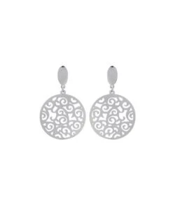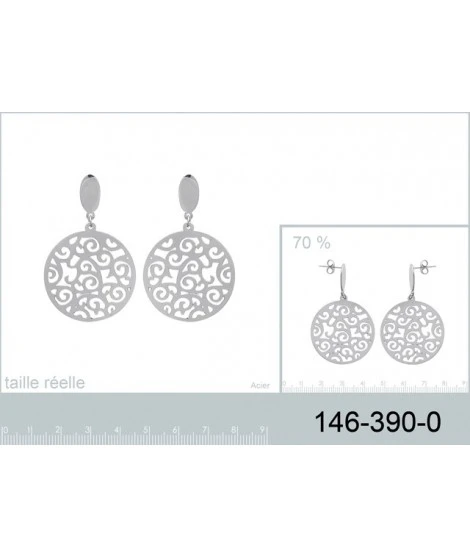 Boucles d’oreilles en acier inoxydable, magnifique mĂ©daille ronde ajourĂ©e avec motifs. Diamètre : 30 mm. Hauteur totale : 42 mm. LivrĂ©es dans leur jolie pochette organza.