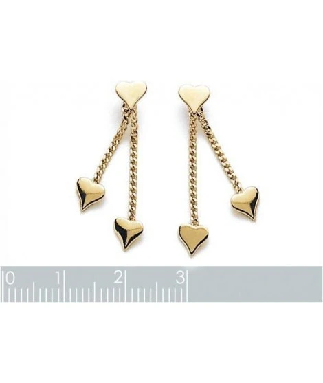 Boucles d’oreilles en plaquĂ© or garanti 10 ans, pendantes avec chaĂ®ne et 3 coeurs plats. Hauteur totale : 28 mm. LivrĂ©es dans leur jolie pochette.