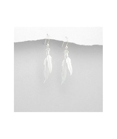 Boucles d’oreilles en argent 925/000, comportant chacune 2 jolies plumes. Les plumes sont identiques sur les 2 faces. Hauteur totale : 44 mm. Poids d’argent : 2,6 grammes. LivrĂ©es dans leur jolie pochette organza.