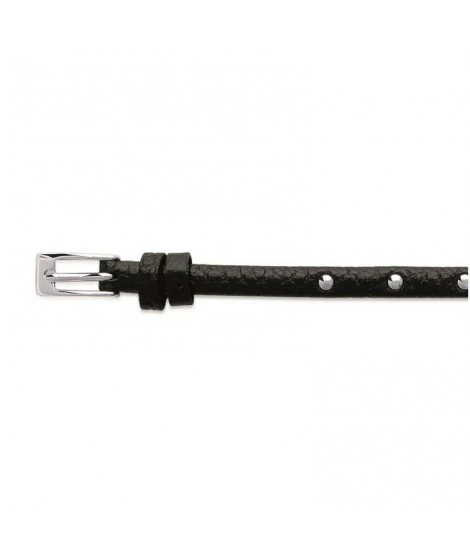 Bracelet en acier et cuir clouté, avec fermoir ceinture. Très tendance en faisant 3 tours du poignet. Diamètre : 62 cm ajustable. Largeur : 5 mm. Livré dans sa jolie pochette en organza.