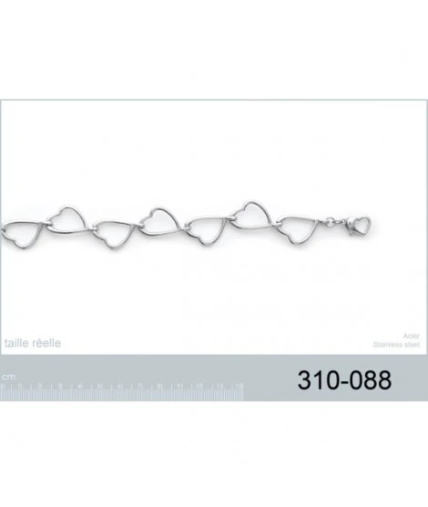 Bracelet en acier composé de 7 jolis coeurs accrochés les uns aux autres. Fermoir mousqueton en forme de coeur. Longueur : 19 cm. Largeur : 15 mm. Chaînette de réglage. Livré dans sa jolie pochette en organza.