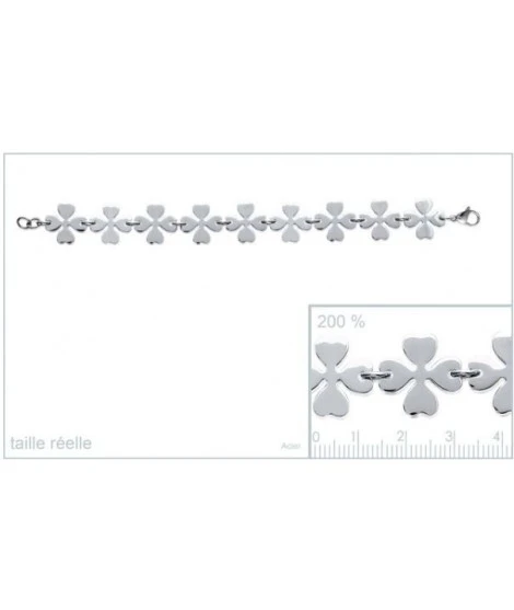 Très joli bracelet en acier, composé de 9 trèfles porte-bonheur. Longueur : 19 cm. Largeur : 17 mm. Fermoir mousqueton. Livré dans sa jolie pochette organza.
