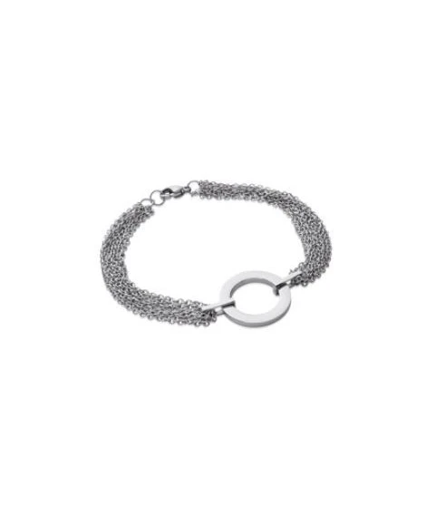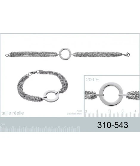 Bracelet en acier avec anneau au centre, rangée de 5 chaînes de chaque côté, et fermoir mousqueton. Très solide, chic et tendance. Livré dans sa jolie pochette organza.
