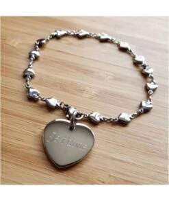 Bracelet en acier composĂ© d’une jolie chaĂ®ne faĂ®te de coeurs, et d’un pendentif en forme de coeur Ă graver. Coeur : 20 x 20 mm. Bracelet : 18 cm. Fermoir mousqueton. Gravure sur le recto comprise dans le prix. LivrĂ© dans sa jolie pochette organza.