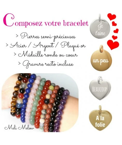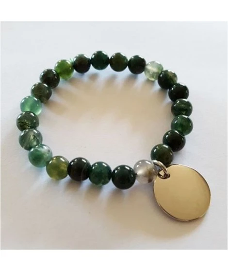 Bracelet sur fil élastique, en perles de pierres gemmes, agathe verte. Chaque perle mesure 8 mm de diamètre. Choisissez dans les options si vous préférez en pendentif, une médaille ronde 20 mm ou un coeur, en acier, argent 925/000 ou plaqué or garanti 10 ans. Gravure sur le recto comprise dans le prix. Chaque bracelet est unique et peut comporter des irrégularités. Livré dans sa jolie pochette.