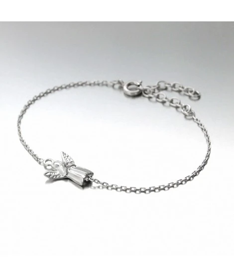 Bracelet en argent 925/000, pendentif ange central. L’ange tient entre ses mains un joli petit oxyde de zirconium bien brillant. Longueur : 18 cm. Largeur : 11 mm. Poids d’argent : 1,06 gramme. LivrĂ© dans sa jolie pochette.