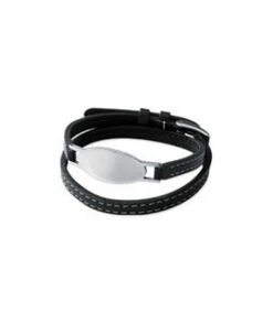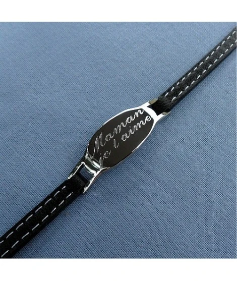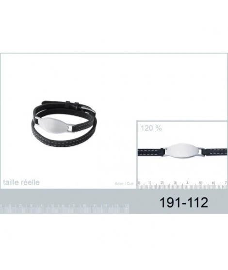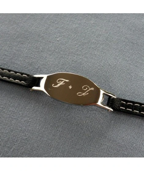Bracelet en acier et cuir noir de grande qualité. Fermoir ceinture. 2 tours de poignet. Longueur : 18 cm. Largeur : 12 mm. A porter avec ou sans gravure (comprise dans le prix). Livré dans sa jolie pochette en organza prête à offrir.