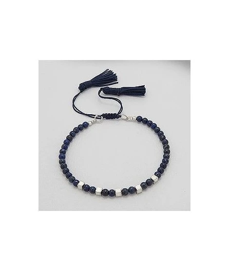 Bracelet chic et bohème avec perles carrées en argent 3 mm, perles rondes de lapis lazuli 4 mm et pompons bleu marine. Ajustage de 15 à 22,5 cm. Livré dans sa jolie pochette.