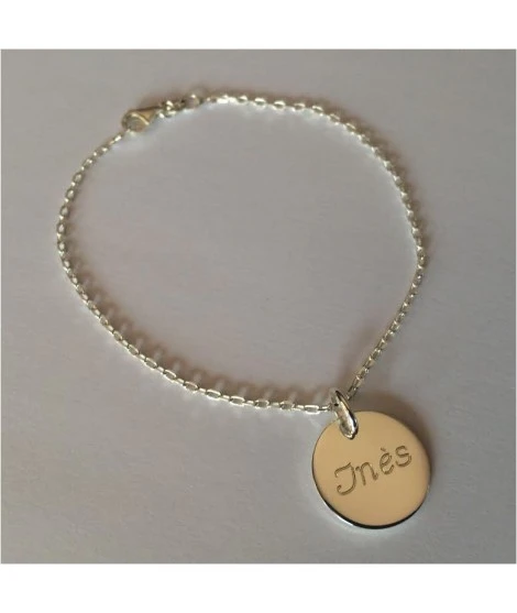 Bracelet en argent 925/000 maille « forçat diamantée », longueur 18 cm, et médaille ronde en argent 925/8000 également, diamètre 15 mm, avec la gravure de votre choix. Gravure sur le recto comprise dans le prix. Fermoir mousqueton. Simple et élégant ! Livré dans sa jolie pochette organza.