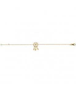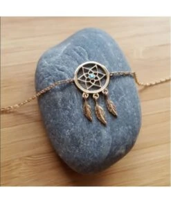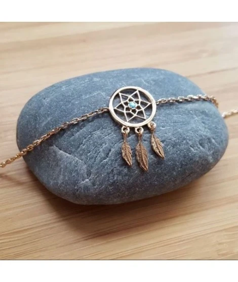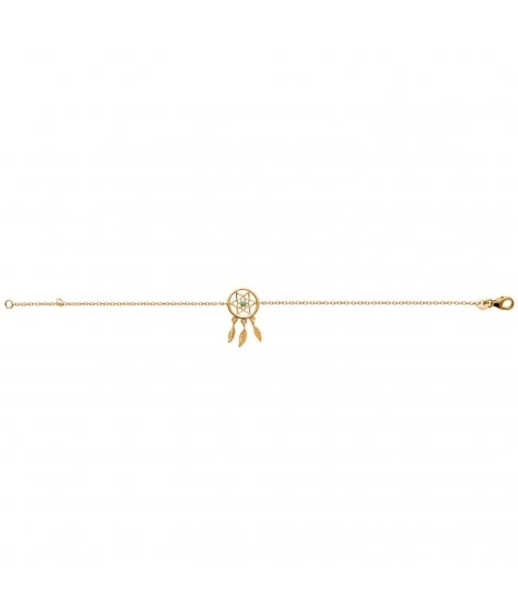 Bracelet en plaqué or garanti 10 ans, très joli avec son attrape-rêve au centre. Longueur : 18 cm, avec un anneau de rappel à 16 cm pour les poignets fins. L’attrape rêve mesure 21 x 11 mm. Livré dans sa jolie pochette.