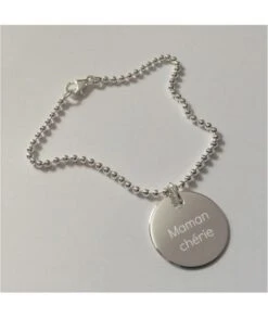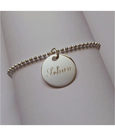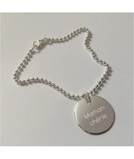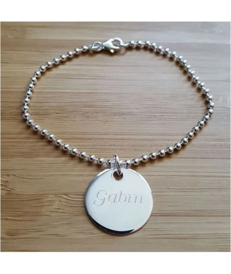 Bracelet boules en argent 925/000, largeur 2 mm, avec jolie mĂ©daille plate de 20 mm de diamètre. Fermeture mousqueton. Longueur : 18 cm. Poids d’argent total : 4,71 grammes. Gravure sur le recto comprise dans le prix. LivrĂ© dans sa jolie pochette organza.