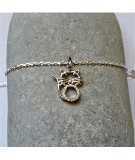 Bracelet en argent 925/000 sur chaine de 18 cm de longueur, avec joli pendentif chat chaton minet. Longueur : 18 cm. Hauteur du chat (hors bélière) : 15 mm. Largeur : 15 mm. Laissez-vous séduire par ce joli chaton qui a de belles moustaches et qui brille avec ses oxydes de zyrconium. Fermoir mousqueton. Livré dans sa jolie pochette.