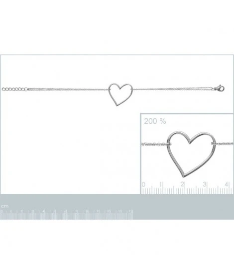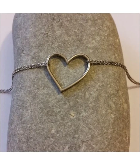 Bracelet en acier, avec joli coeur au centre. Longueur : 18 cm. Hauteur du coeur : 22 mm. Fermoir mousqueton. Livré dans sa jolie pochette organza.