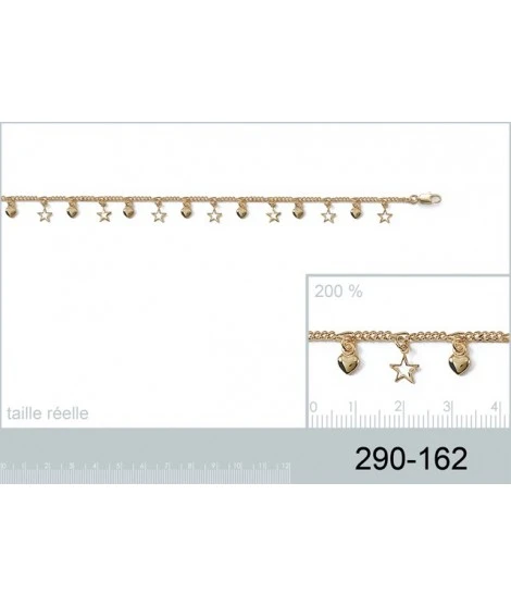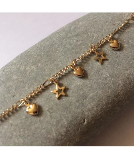 Bracelet plaqué or garanti 10 ans, avec breloques pendantes 5 coeurs et 5 étoiles. Longueur : 18 cm. Fermoir mousqueton. Livré dans sa jolie pochette organza.