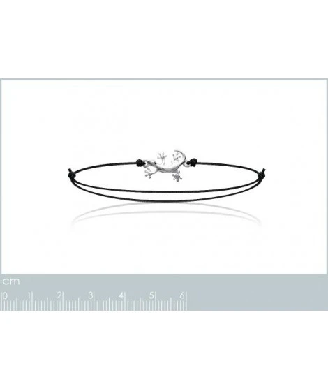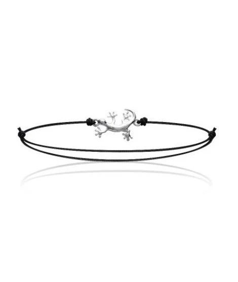 Bracelet sur cordon de couleur noire, avec joli petit lĂ©zard, salamandre, en argent. LĂ©zard : 16 x 10 mm. Poids d’argent : 0,74 grammes. Fermeture par noeuds coulissants. LivrĂ© dans sa jolie pochette organza.