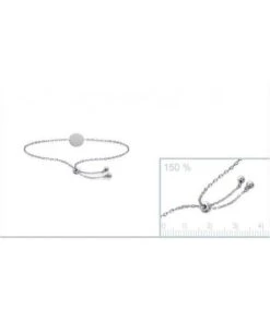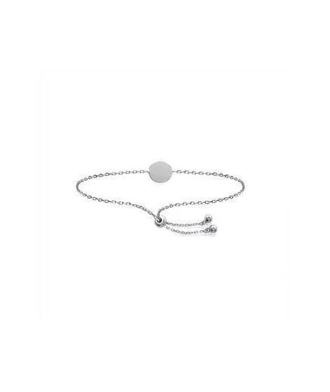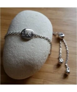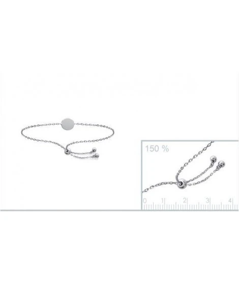 Bracelet en argent rhodié sur chaîne qui coulisse dans une perle, médaille à graver de 9 mm de diamètre. Gravure sur le recto comprise dans le prix. Longueur totale : 25 cm. Très joli bijou. Poids d’argent : 2,25 grammes. Livré dans sa jolie pochette.