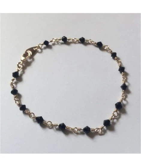 Adorable bracelet plaqué or et perles de cristal noir. Longueur : 18 cm. Plaqué or garanti 10 ans. Fermeture mousqueton. Livré dans sa jolie pochette organza. Pensez à ajouter un pendentif pour le personnaliser (rubrique « Tout en kit »).
