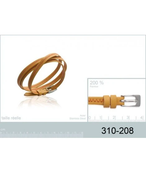 Bracelet top tendance 3 petits tours en cuir jaune et fermoir ceinture acier. Couture en zig-zag fil surpiqué. Longueur : 60 cm. Livré dans sa jolie pochette en organza.