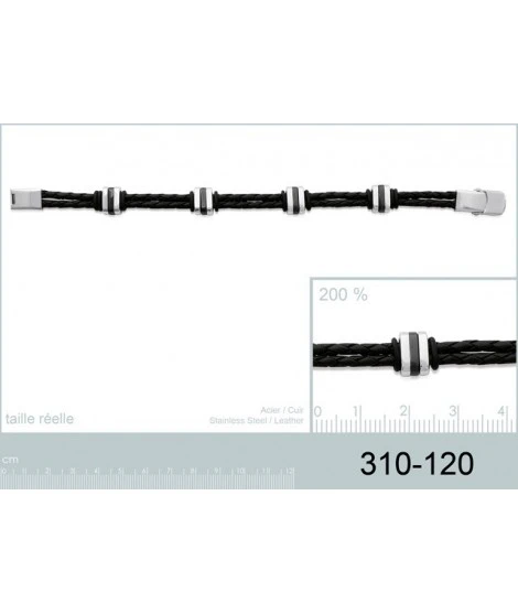 Bracelet mixte en cuir tressé noir et perles ovales en acier. Fermoir plat. Longueur : 19 cm environ. Livré dans sa jolie pochette en organza.