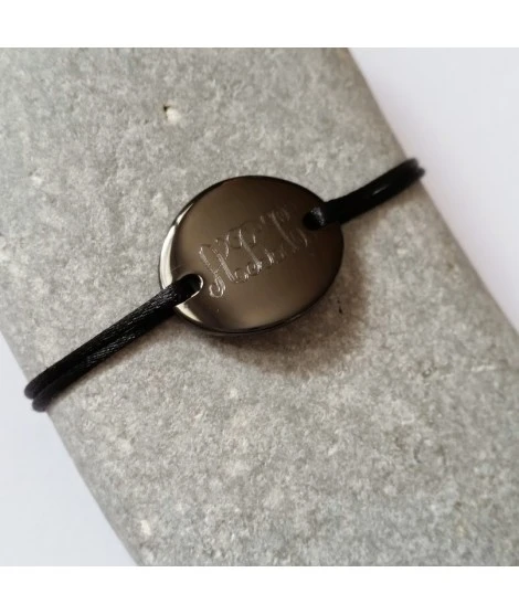 Bracelet sur cordon de couleur au choix, avec superbe galet noir en acier à personnaliser avec le texte de votre choix. Gravure sur le recto uniquement (comprise dans le prix). Galet : 24 x 20 mm. Epaisseur : 1,5 mm. Livré dans sa jolie pochette.
