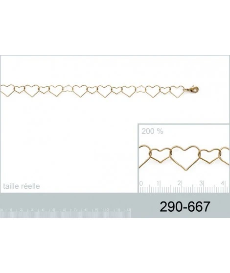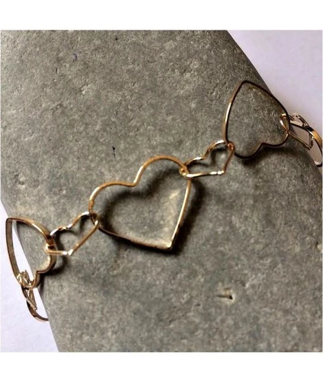 Bracelet plaqué or garanti 10 ans composé de 14 coeurs de différentes tailles. Le plus grand coeur mesure 19 par 17 mm. Longueur : 19 cm. Fermoir mousqueton. Idéal pour y ajouter vos charms. Livré dans sa jolie pochette organza.