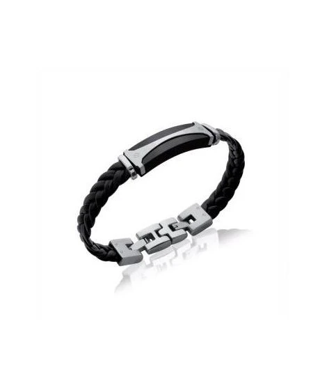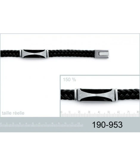 Bracelet pour homme en cuir noir tressé et acier. Longueur : 19 cm. Fermoir plat. Largueur 12 mm. Pièce centrale : 40 x 12 mm. Livré dans sa jolie pochette en organza.