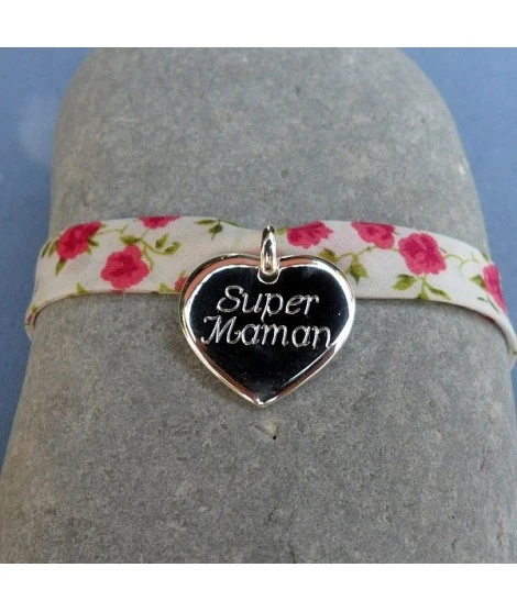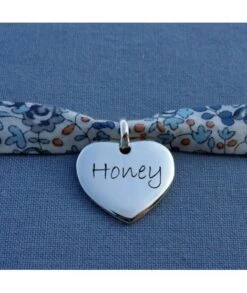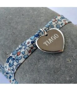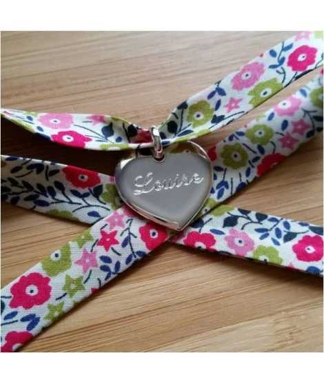 Adorable bracelet sur ruban Liberty, accompagné de son joli coeur 20 mm, en argent 925/000 ou plaqué or garanti 10 ans. Tout est compris dans ce petit prix : le cordon Liberty + le pendentif + la gravure sur le recto + la jolie pochette organza prête à offrir.