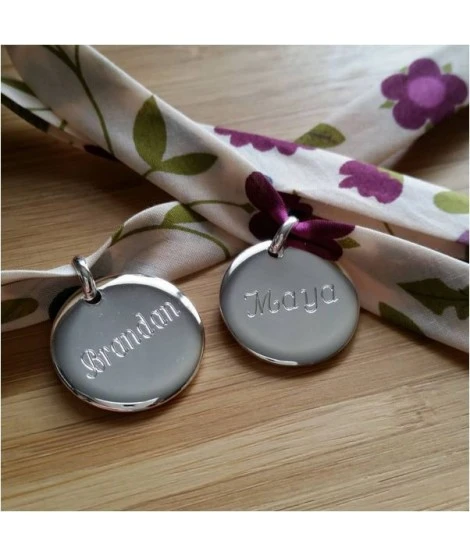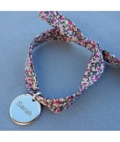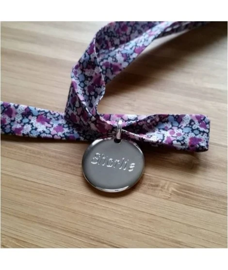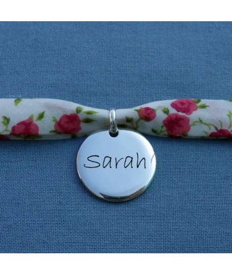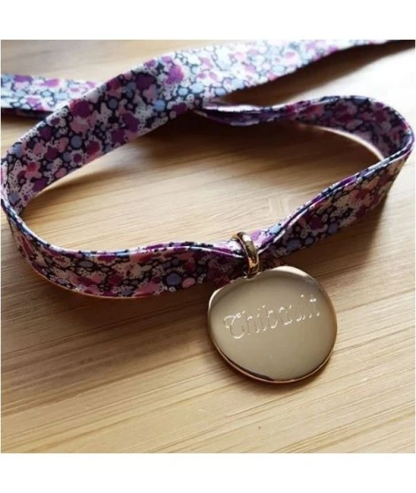 Adorable bracelet sur ruban Liberty, accompagné de sa belle médaille ronde de 20 mm, en argent ou plaqué or. Tout est compris dans ce petit prix : le cordon Liberty + le pendentif + la gravure recto + la jolie pochette organza prête à offrir.