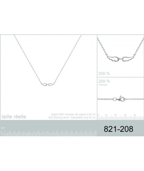 Bracelet (18 cm / 1,03 gramme d’argent) ou collier (45 cm / 3,01 grammes d’argent) en argent 925/000, avec 2 belles ailes d’ange qui se tiennent. Anneau de rappel pour les poignets ou les cous les plus fins. LivrĂ© dans sa jolie pochette en organza prĂŞte Ă offrir. Offrez-vous la parure !