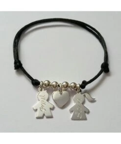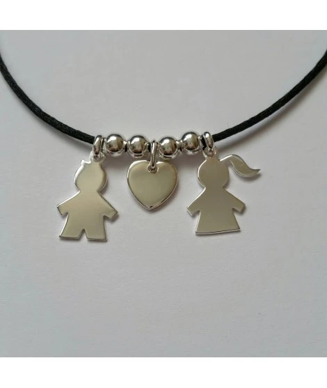 Bracelet ou collier sur cordon de couleur au choix, avec 2 personnages argent (fille et/ou garçon), 4 perles acier (qui ne s’Ă©crasent pas) et 1 petit coeur argent. Gravures des 2 personnages (recto) comprises dans le prix. Fermeture par noeuds coulissants ou fermoir en option. LivrĂ© dans sa jolie pochette.