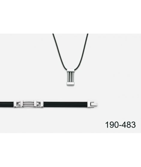 Bracelet 21 cm, ou collier avec cordon couleur au choix fermé par 2 noeuds coulissants. Acier et caoutchouc noir sur le bracelet. Livré dans sa jolie pochette organza.