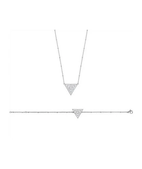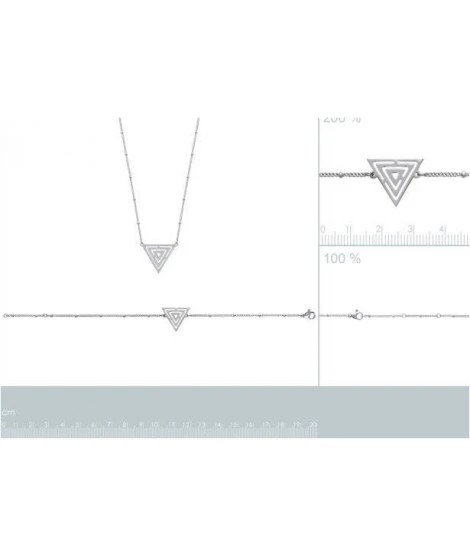 Bracelet ou collier (en option) en acier, avec joli triangle stylisé au centre. Fermoir mousqueton. Bracelet : 18 cm. Collier : 45 cm. Offrez-vous les 2 pour porter cette jolie parure. Livré dans sa jolie pochette.