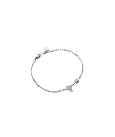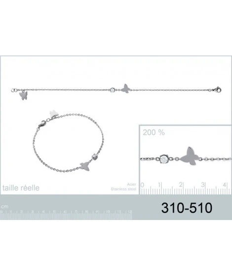 Très joli petit bracelet en acier avec 2 papillons et 1 oxyde de zirconium brillant. Fermeture mousqueton. Longueur : 19 cm. Papillon : 8 x 8 mm. Livré dans sa jolie pochette organza.