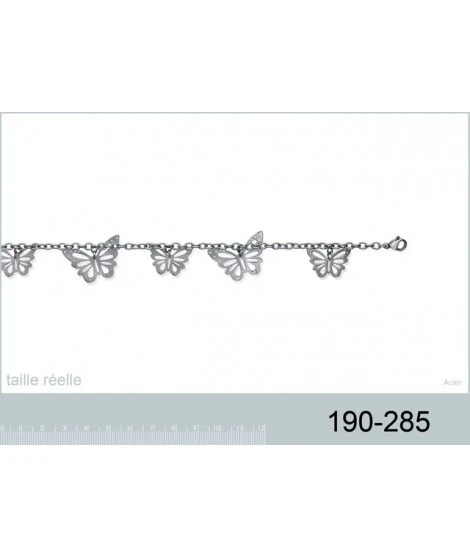 Joli bracelet en acier sur chaîne avec 5 papillons pendants breloques (3 petits de 20 mm + 2 grands de 25 mm de largeur). Longueur : 18 cm. Fermoir mousqueton. Beau design et très solide ! Livré dans sa jolie pochette en organza prête à offrir.