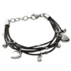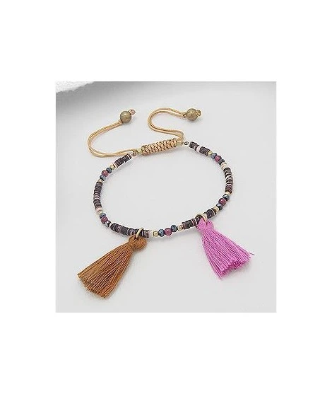 Bracelet sur cordon en polyester, avec perles (verre, crystal, coquillage) de plusieurs couleurs et 2 pompons rose et marron. Ajustable par noeuds de 15 à 22,5 cm. Livré dans sa jolie pochette.