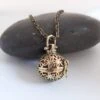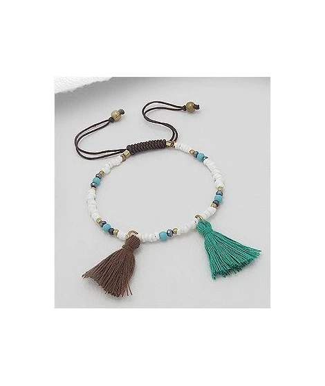 Bracelet sur cordon en polyester, avec perles (verre, crystal, coquillage) de plusieurs couleurs et 2 pompons vert et marron chocolat. Ajustable par noeuds de 15 à 22,5 cm. Livré dans sa jolie pochette.