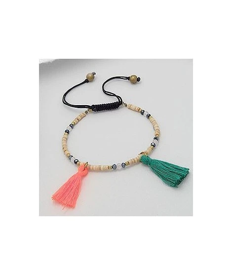 Bracelet sur cordon en polyester, avec perles (verre, crystal, coquillage) de plusieurs couleurs et 2 pompons vert et orange. Ajustable par noeuds de 15 à 22,5 cm. Livré dans sa jolie pochette.