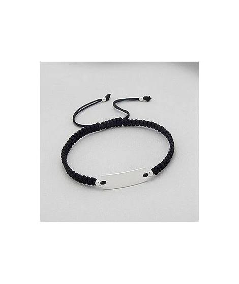Bracelet noir avec rectangle en argent 925/000 à graver sur le recto et cordon tissé, perle à chaque extrémité. Poids d’argent : 1,8 gramme. Rectangle : 20 x 7 mm. Livré dans sa jolie pochette.