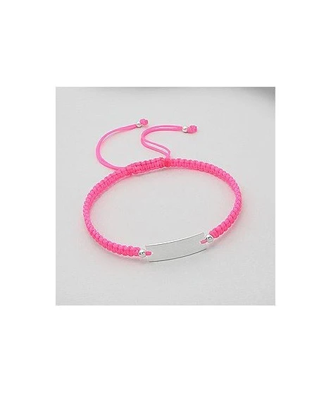 Bracelet rose fluo avec rectangle en argent 925/000 à graver sur le recto et cordon tissé, perle à chaque extrémité. Poids d’argent : 1,8 gramme. Rectangle : 20 x 7 mm. Livré dans sa jolie pochette.