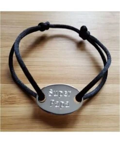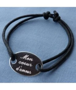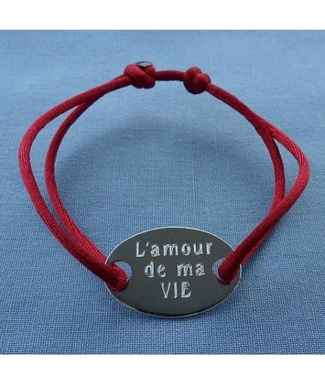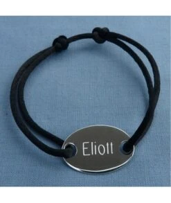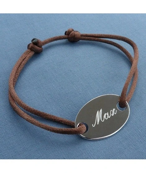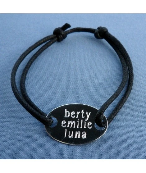Bracelet composĂ© d’un ovale 2 trous en argent 925/000. Cordon ajustable par noeuds coulissants, couleur au choix. Gravure recto comprise dans le prix. LivrĂ© dans une jolie pochette en organza prĂŞte Ă offrir.