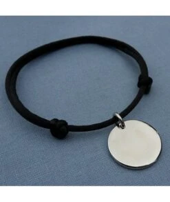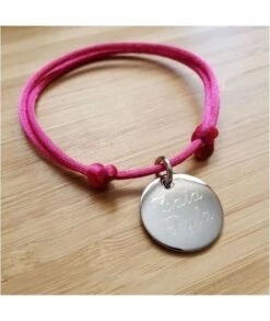 Bracelet avec médaille ronde légèrement bombée, en acier. Cordon ajustable par noeuds coulissants, couleur au choix. Diamètre de la médaille : 20 mm. Gravure recto et verso possible. Livré dans sa jolie pochette en organza prête à offrir.