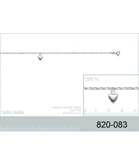 Chaîne de cheville en argent 925/000, avec pendentif coeur (identique des 2 côtés).